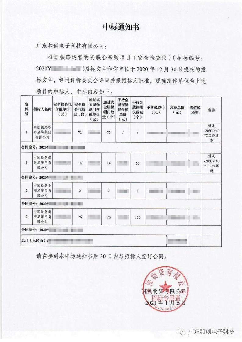 国家铁路集团总公司,公开招标铁路安全检查仪,在经过激烈的竞争之后,欧冠联赛联赛压球凭借良好的产品质量和优异的服务质量中标此次采购项目。中标安全检查设备,包括:“X光行李安检机、金属探测门、手持金属探测仪”。今后的一段时间欧冠联赛联赛(中国)电子需要为中铁哈尔滨局、南昌局、上海局和南宁局这四家铁路局提供中标通知书中所提到的所有安全检查仪。